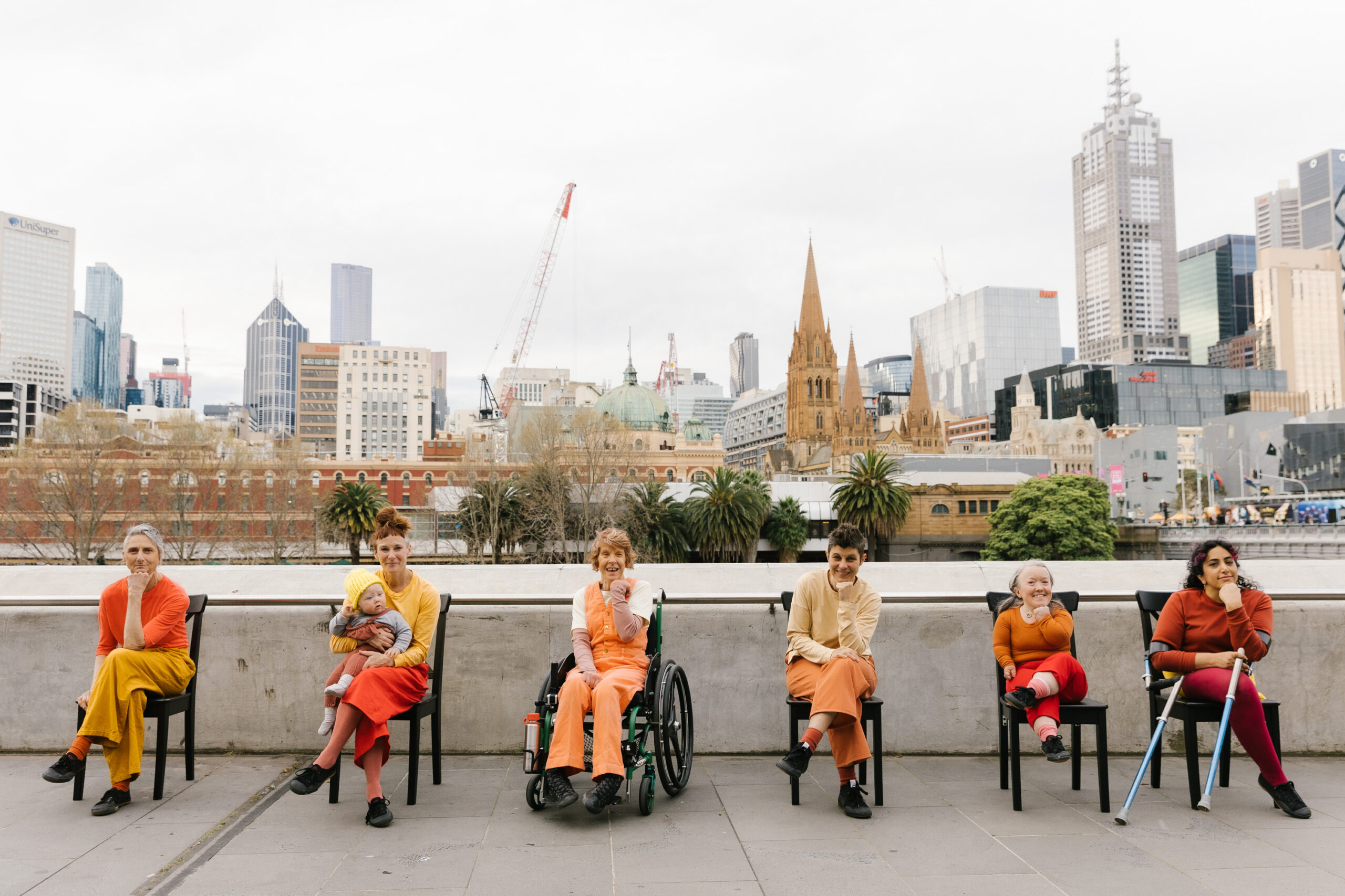 Momentum cast sitting in chairs posing in front of Melbourne city. Credit Kate Disher-Quill